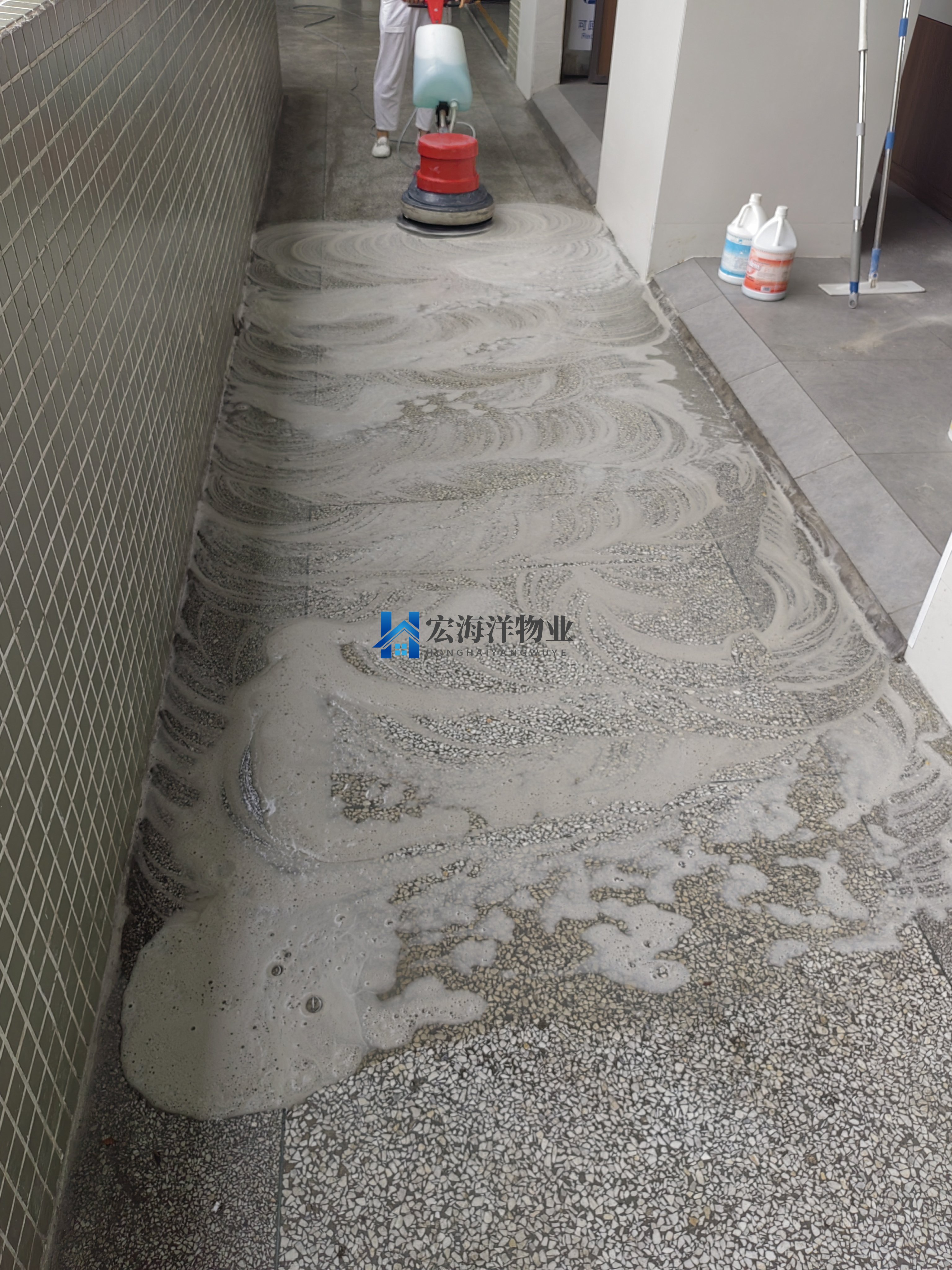 水磨石需要專業(yè)的洗地機(jī)加清洗墊,專業(yè)清洗劑